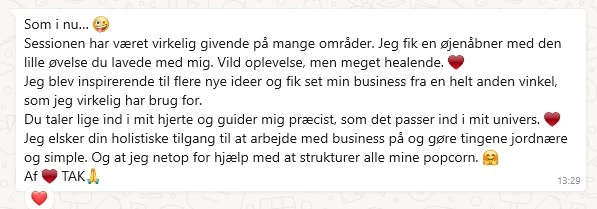 Du får spejling når du møder modstand, feedback når du er i gang med øvelserne, og min ubetingede støtte og opbakning, til alt det der dukker op undervejs.