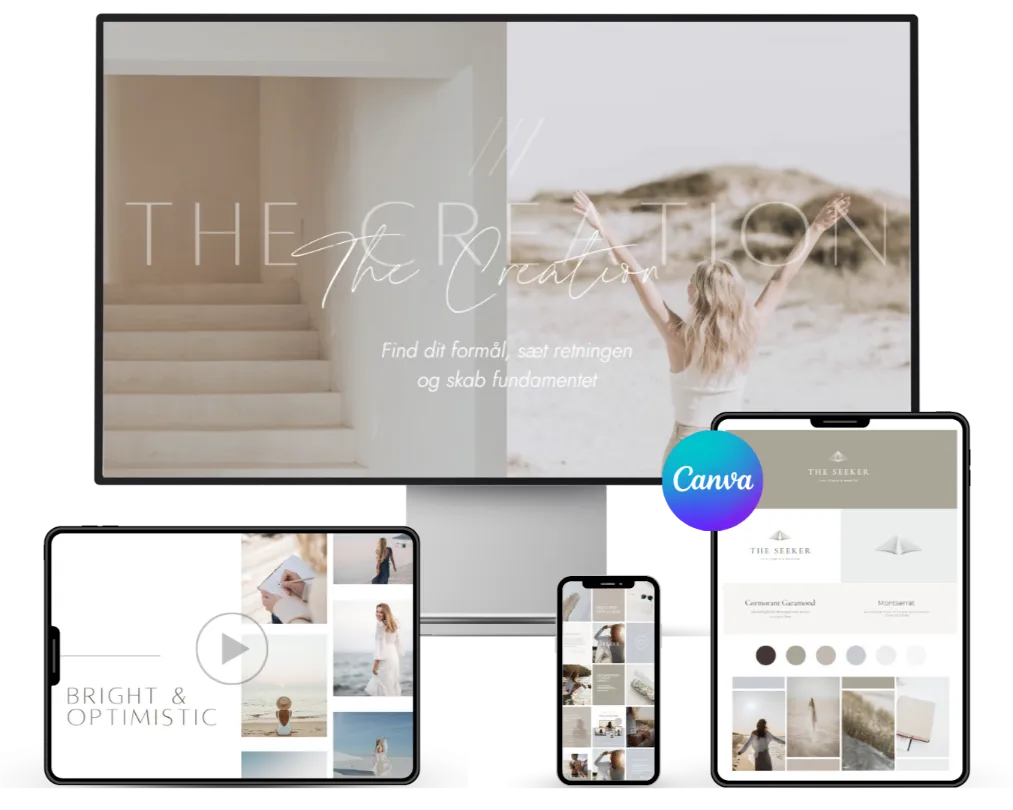 Alt du skal bruge til at skabe dit eget visuelle udtryk ~Brand Identitet (brand board, mood boards, farver, skrifttyper og billeder). Du guides via udførlige vejledninger og skabeloner, så du kan udfolde din kreativitet og skabe det hele i Canva.